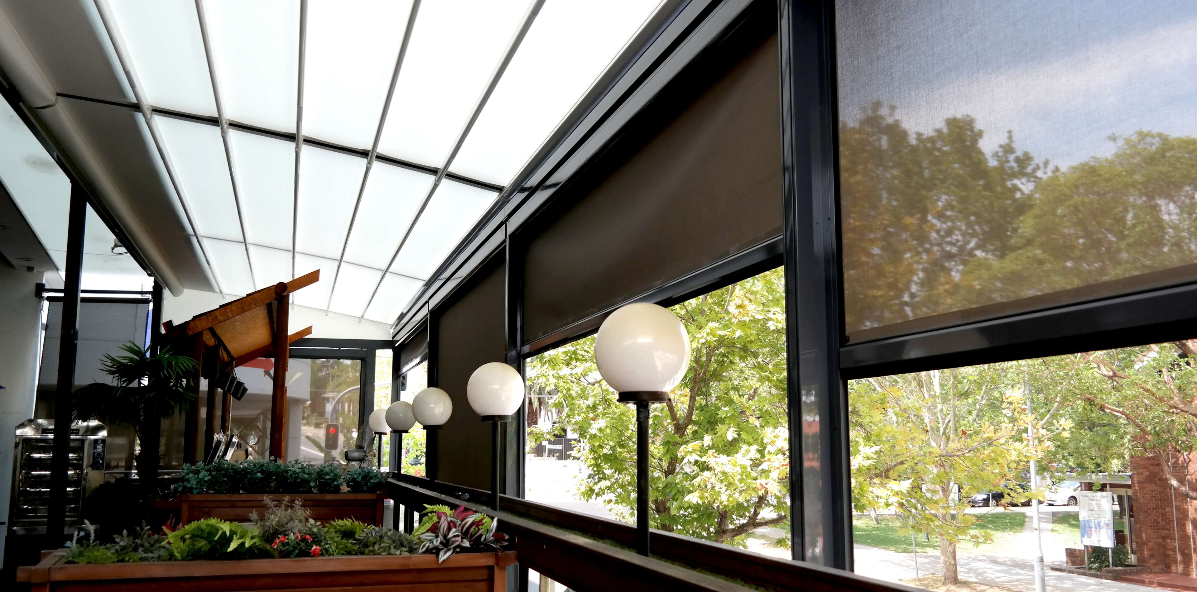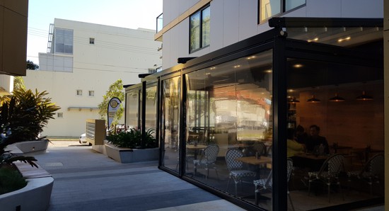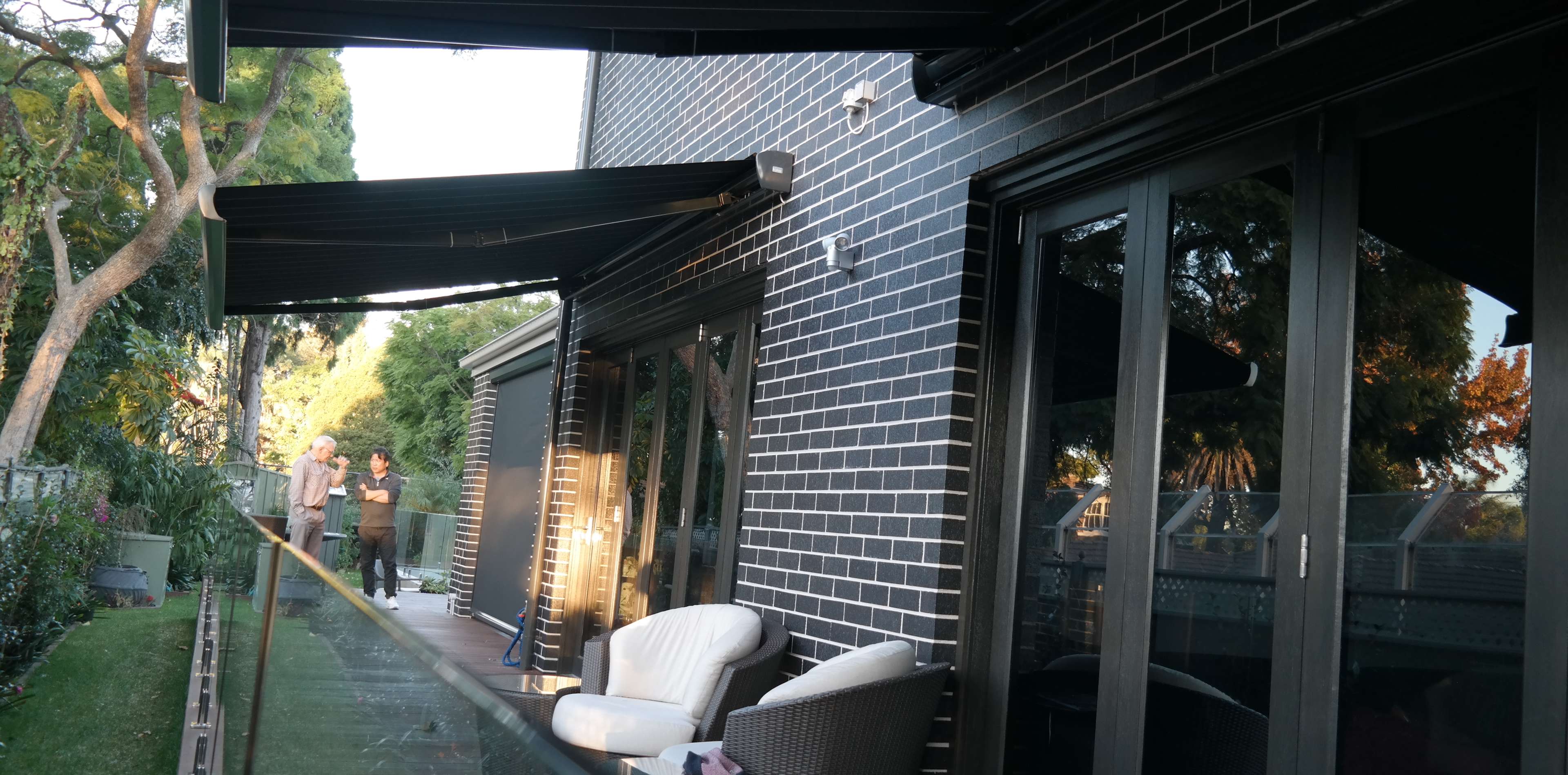 The Australian designed and manufactured Genius range of straight drop awnings has the characteristics required to enhance your outdoor living areas. The Genius AutoLock enables you to close off an area where channels are not appropriate. As the fabric is set deep within the side profiles, there is little to no risk of the fabric slipping out of the channels. The Autolock function is able to be locked without the pin, by use of the hook profile. The fabric maintains its tension in heavy winds, and the system is easy to use. Furthermore, it can be effortlessly integrated into other existing structures.